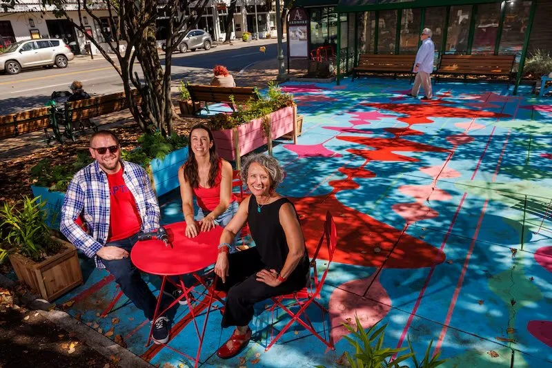 Craig Timberlake (from left), Kate Cronin, and Deirdre Murphy led the redesign of Ardmore's Schauffele Plaza through "tactical urbanism."